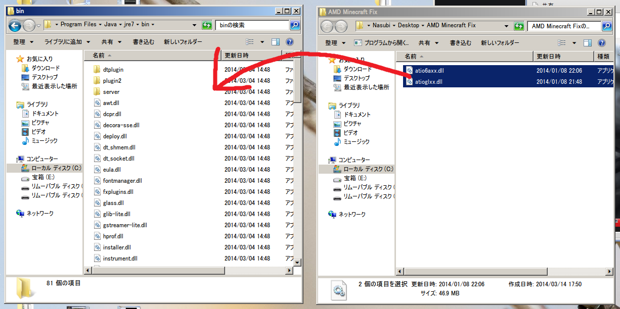 Mantle対応版ドライバだとMinecraftのブロックが映らない! こんばんは先日、身内でMinecraftをやろうということになり早速起動!・・・ってあれ!?ブロックが一切映らないんですけど・・・ 唯一見えるのはブロックの範囲?の枠と月と太陽と松明の明かりだけ・・・あ、絵画もみえる!まあ、とにかく色々映らないんです。真っ先に自分はMODが原因だと思い、バニラでプレイしてみても映らねぇ!こうなったらJavaも再インストール!!映らねぇ!マイクラがイカれてるのか!!bin入れなおし!!映らねぇ!というわけで、色々と試行錯誤した結果・・・つい最近PC内で何を変更したか色々思い出してみることに・・・すると前の記事で書いたとおり R9 290 を買ってウホウホしていた私は早速出たばかりのマントル対応のディスプレイドライバ(ベータ版)に入れ替えてました。早速グーグル先生に「まんとる まいんくらふと」で尋ねるとあれ、何も出ない。こういうのは米国のほうが情報早いはず!「mantle minecraft」で再度尋ねなおすと・・・キタ━━━━(゚∀゚)━━━━!!たくさん出てくるじゃないですか!!!というわけで、以下やり方を日本語訳したものです。ご参考にまでどうぞ①修正するためのパッチをDL こちらのmediafilerに飛んで緑のDownloadボタンをクリック! ↑こんなやつ②パッチを適用! ダウンロードしたやつを解凍して Cドライブ→Program Files→Java→jre7→binを開きます。 その中に解凍した物を突っ込みます! するとその際に 管理者権限のダイアログが出ますが↓ 気にせずに続行を押しましょう!③起動確認! そして早速Minecraftを起動・・・ 映った!キタ━━━━(゚∀゚)━━━━!!はい、ハイテンションな説明でした。こんな簡単な2ステップで出来るのでお困りだった方はレッツチャレンジ!!誰か一人のためにでもなれば幸いです(๑╹ڡ╹๑) PR